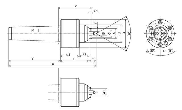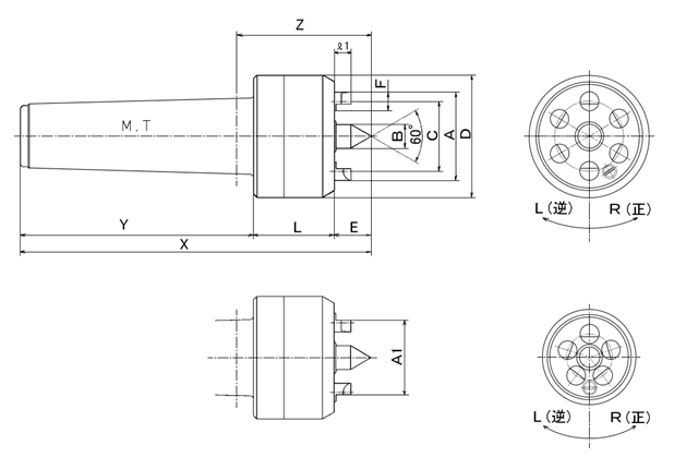 If a workpiece has some inclination on its end face, the jaws of this center are actuated accurately to hold the workpiece in even contact with its end face.