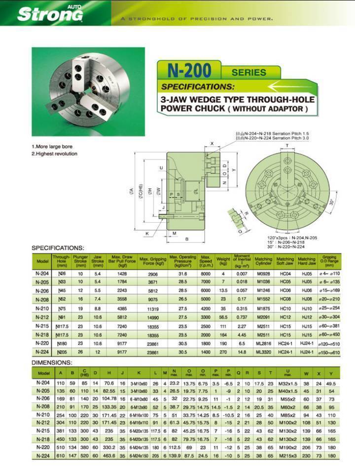 1.N-200 3-Jaw Wedge Type Extra Large Through-Hole Power Chucks (With Adaptor).